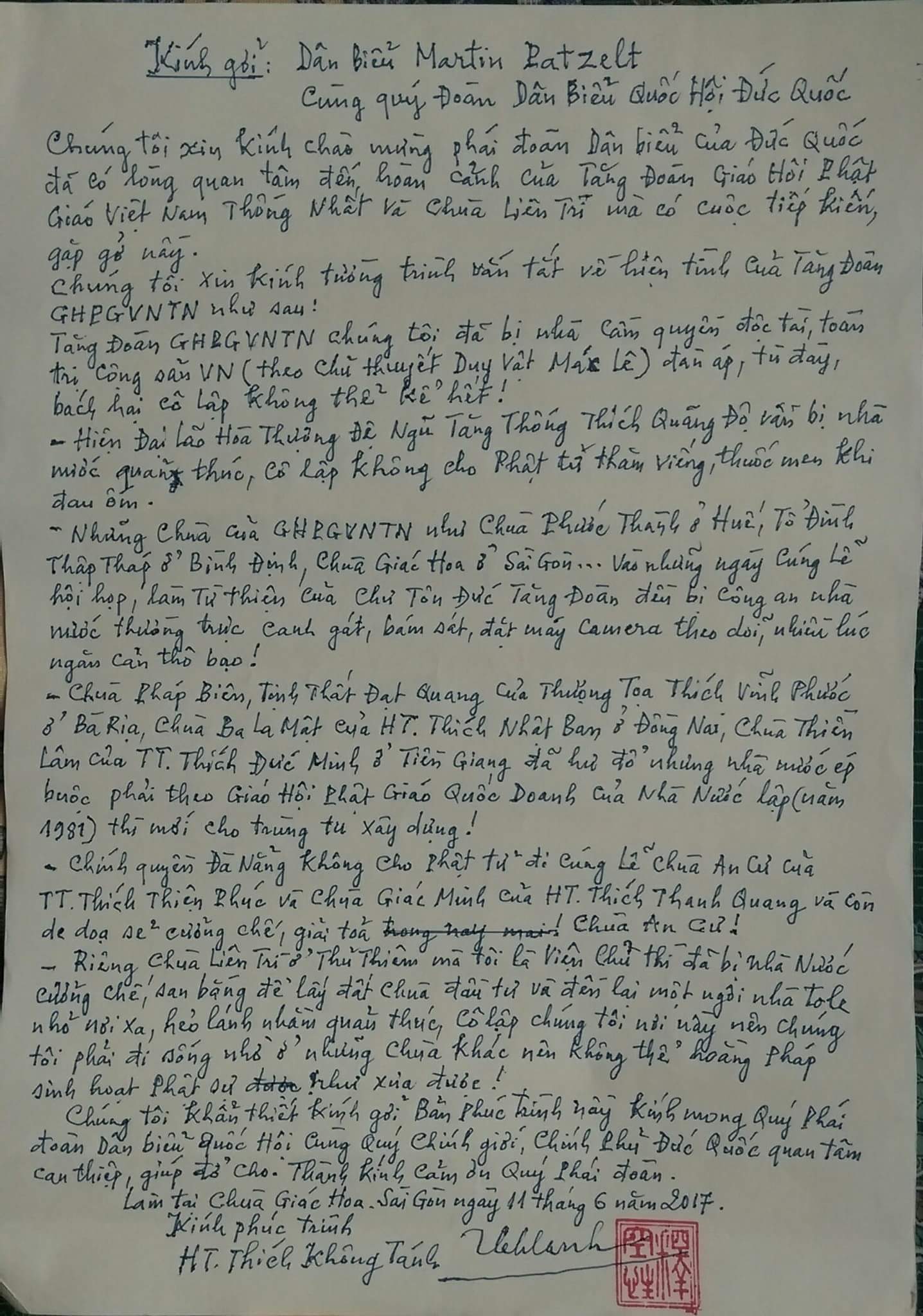 Thư tay HT không Tánh gởi ông Đại sứ Đức và phái đoàn Dân Biểu Quốc Hội Đức trong buổi tiếp kiến vào chiều ngày 11- 6- 2017.