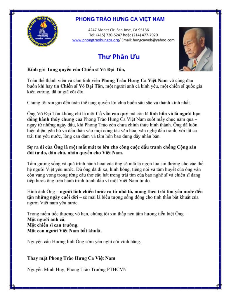 PTHCVN - About Us Thư Phân Ưu – Chiến Sĩ Võ Đại Tôn 9 months ago Continue Reading Previous Phân Ưu – Gs Trần Quang HảiNext Chiều Thơ Nhạc Tưởng Niệm Chiến Sĩ Võ Đại Tôn Tại San Jose